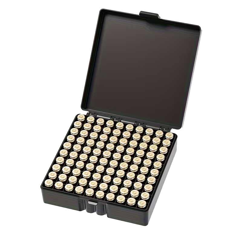 Keep your ammunition organised and protected with this durable plastic ammo box designed to hold up to 100 rounds of 9mm ammunition. The compact, lightweight design makes it ideal for range days, storage, or transport, while the secure snap-close lid helps prevent accidental opening.